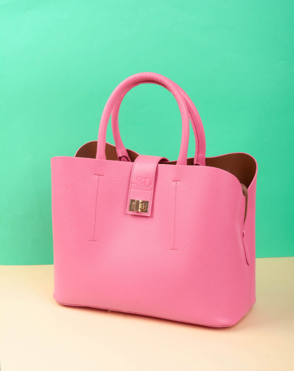 Sac porte main en cuir granuleux de couleur rose bonbon.