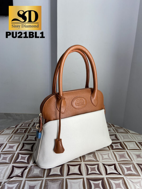 Sac à main avec anse et petit cardenas en cuir granulé deux tons de couleur blanc et marron tabac.