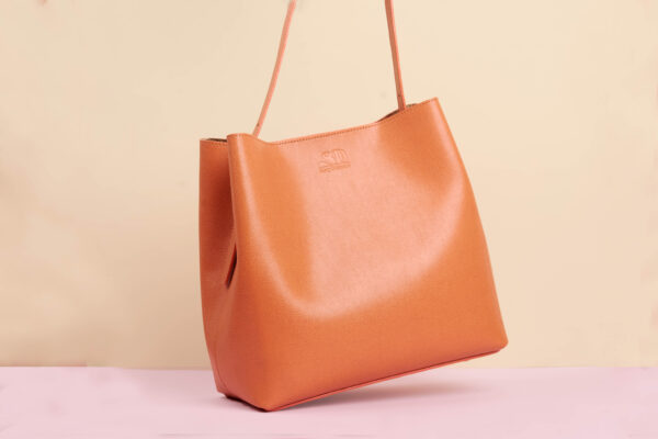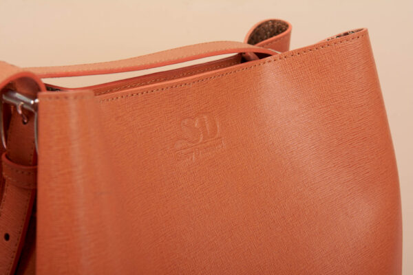 Sac à bandouliére en cuir strié de couleur orange opéra.