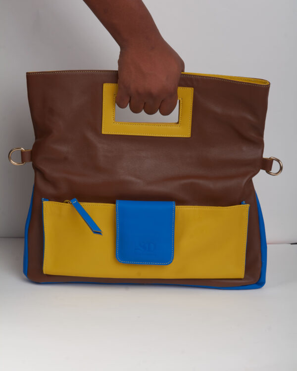 Sac porte-main modulable en fourre-tout avec bandoulière amovible. Une prouesse de design tricolore (marron, bleu, jaune) en cuir lisse. Ce sac se transforme selon vos besoins de la journée, offrant une polyvalence rare associée à une géométrie de couleurs moderne et structurée.