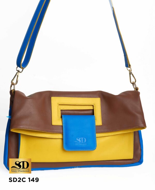 Sac porte main modulable en fourre tout avec une badoulière démontable; Tout en cuir lisse tricolor marron, bleu et jaune.