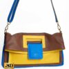 Sac porte-main modulable en fourre-tout avec bandoulière amovible. Une prouesse de design tricolore (marron, bleu, jaune) en cuir lisse. Ce sac se transforme selon vos besoins de la journée, offrant une polyvalence rare associée à une géométrie de couleurs moderne et structurée.