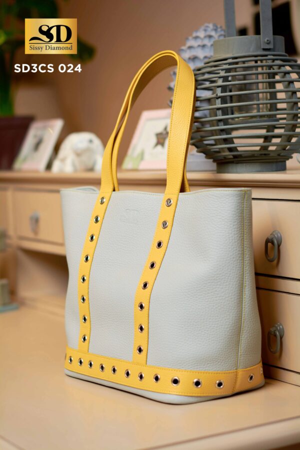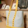 Sac à main fourre tout en cuir granuleux de couleur gris apus aux manches jaunes.