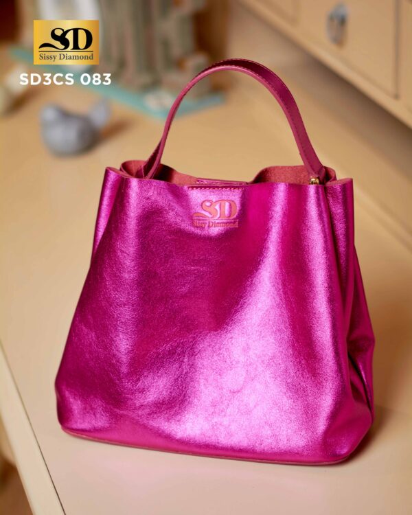 Petit sac à main en cuir métallisé Rose Magenta. Son fini brillant et sa structure noble sont conçus pour les occasions où l’on souhaite briller.